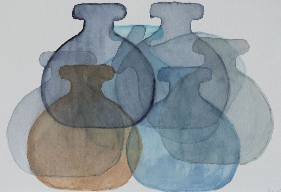 „Flaschen, blau“ – Aquarell auf Papier, 27.7x19cm, 1997
